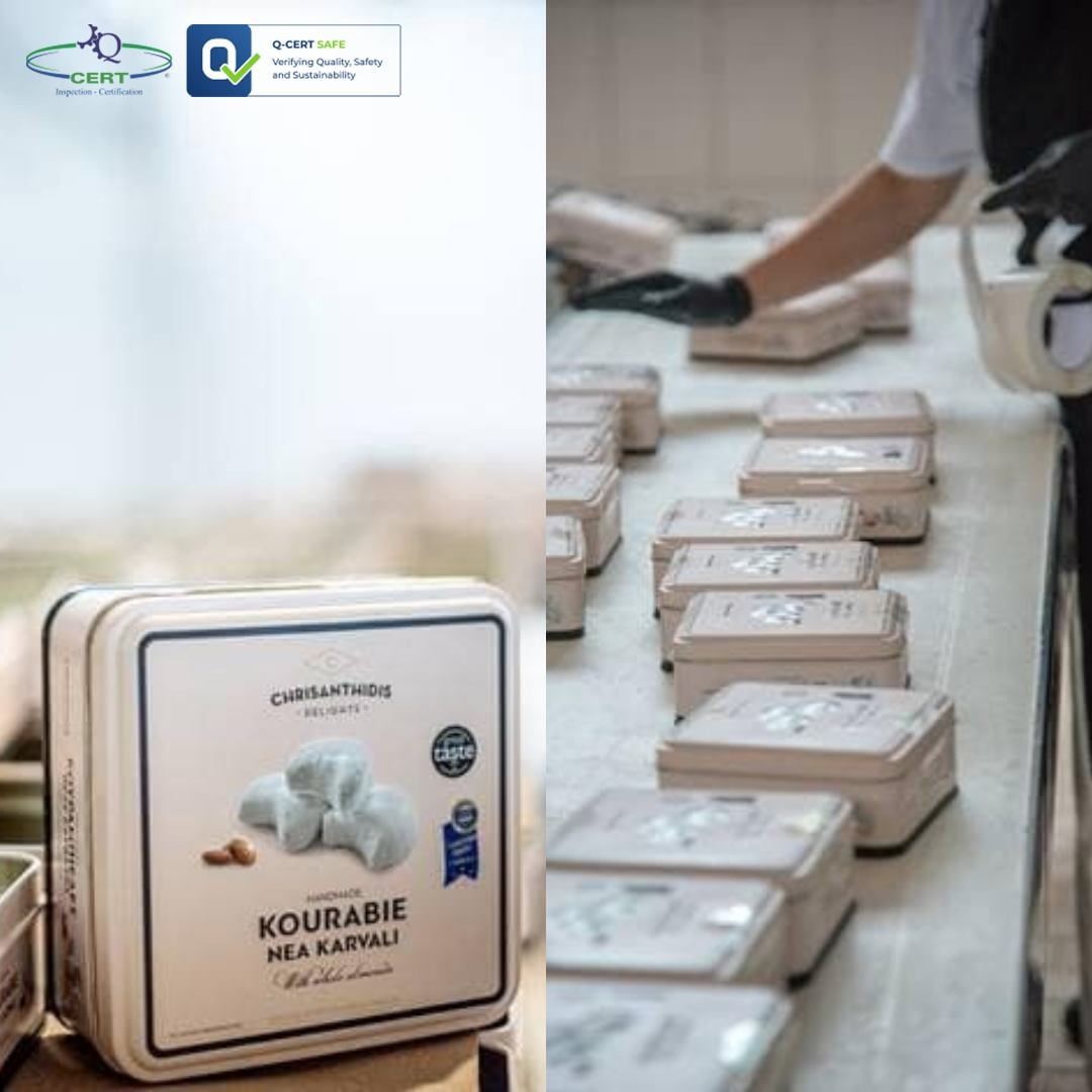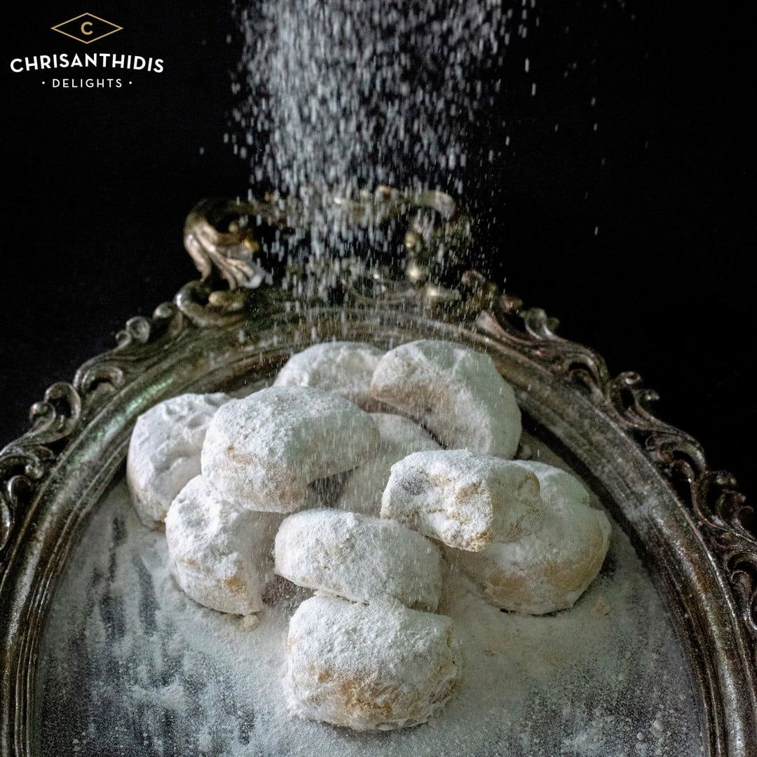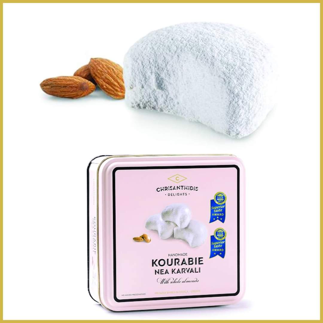 Fursecuri-corăbioare cu migdale întregi (gr netă: 450 g). Kourabies sunt prăjiturele specifice perioadei Sărbătorilor în Grecia, iar producătorul Chrisanthidis Delights a fost recunoscut prin 5 distincții internaționale la concursuri de profil.